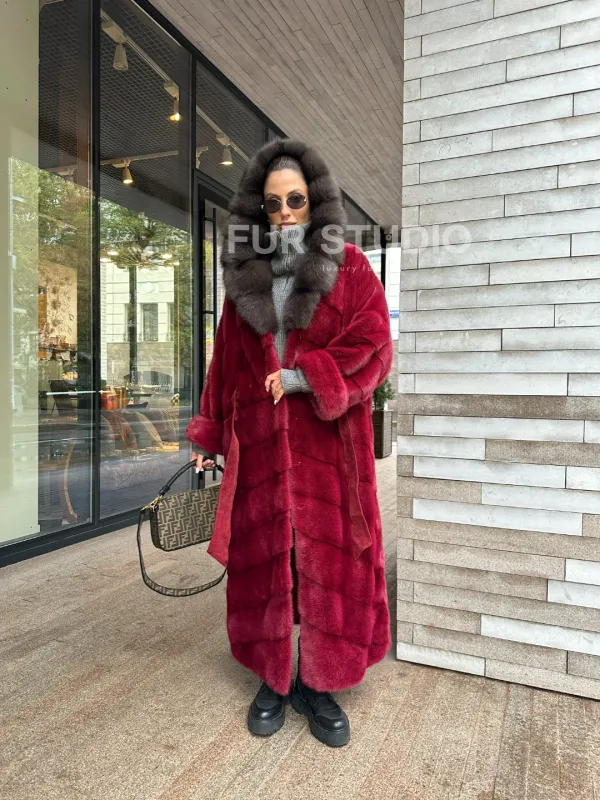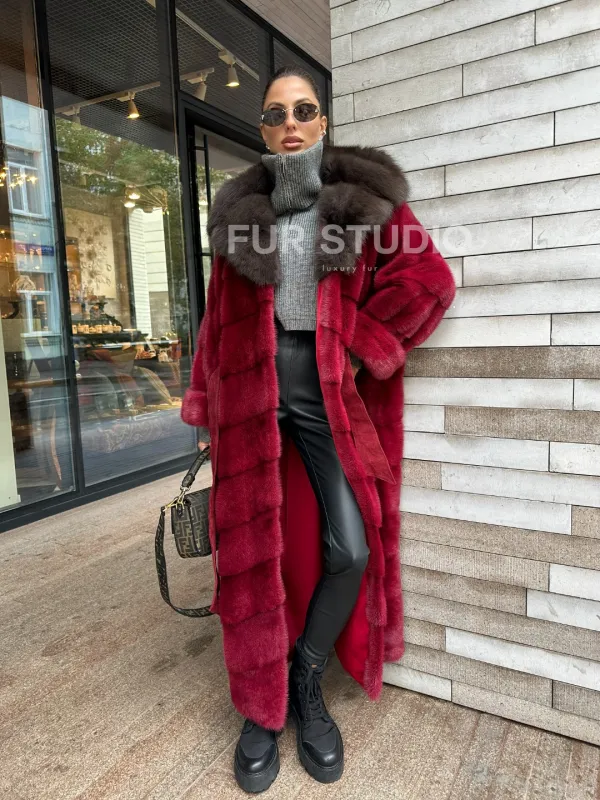 Мех данной шубы аукционная норка, цвет бордовый. Предлагается в размерах от 40 до 50. Длина модели 125-130 см, что выгодно подчеркивает фигуру девушек. Эта модель идеально подойдет для девушек и женщин, предпочитающих роскошные натуральные меха.
