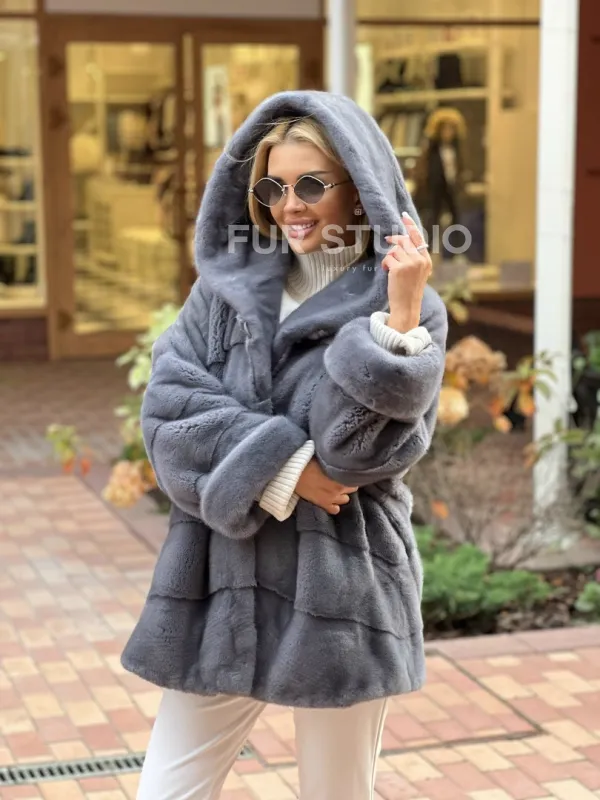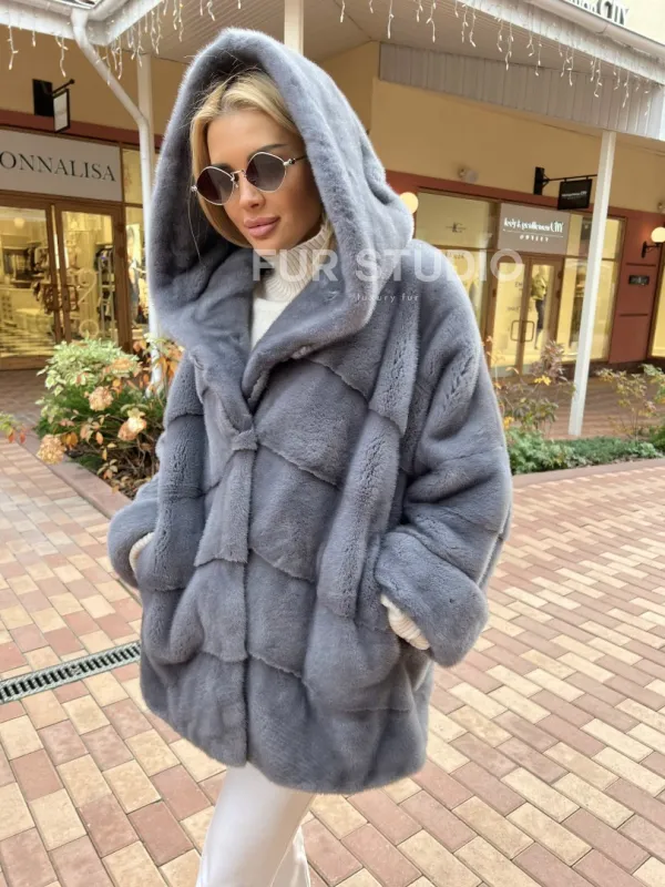 Удобные карманы сохранят тепло ручек. Прямой крой изделия не сковывает движений и скрывает недостатки. Модель удобна, если вы водите машину. Изделие сочетается с базовым гардеробом, подойдет под вечерний look. Добавьте к образу стильную сумочку и оригинальную обувь, вы готовы покорять мир. Купить норковое пончо с капюшоном в цвете графит могут женщины с изысканным вкусом.